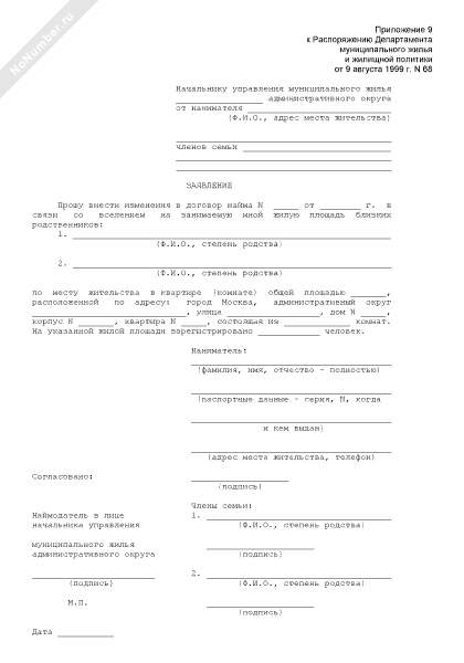 - 1147Заявление о внесении изменений в договор найма в связи со вселением близких родственников в качестве членов семьи нанимателя