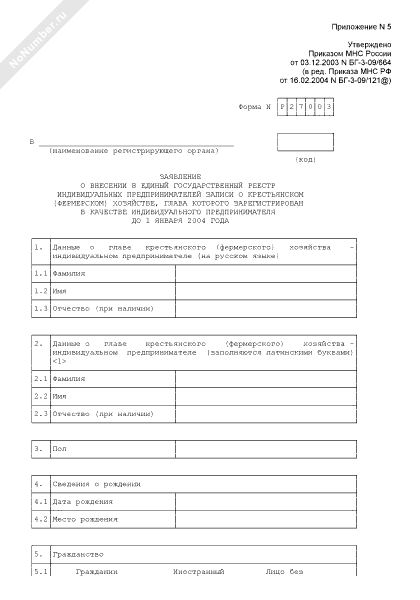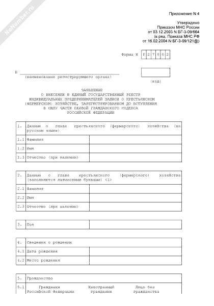 - 1156Заявление о внесении в единый государственный реестр индивидуальных предпринимателей записи о крестьянском (фермерском) хозяйстве, глава которого зарегистрирован в качестве индивидуального предпринимателя до 1 января 2004 года. Форма № Р27003