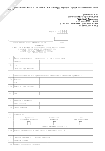 - 1153Заявление о внесении в единый государственный реестр индивидуальных предпринимателей записи об индивидуальном предпринимателе, зарегистрированном до 1 января 2004 года. Форма № Р27001