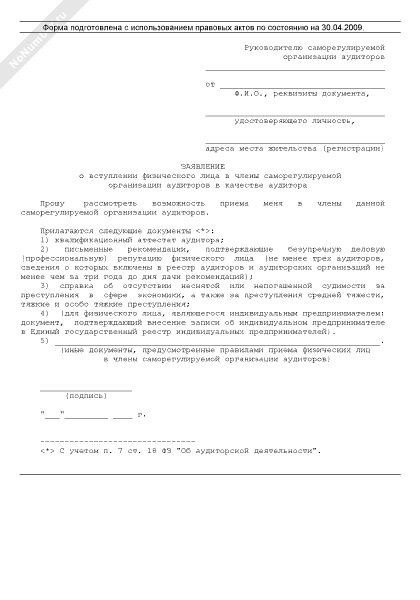 - 1273Заявление о вступлении физического лица в члены саморегулируемой организации аудиторов в качестве аудитора