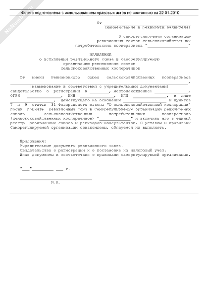 - 1275Заявление о вступлении ревизионного союза сельскохозяйственных кооперативов в саморегулируемую организацию ревизионных союзов сельскохозяйственных кооперативов