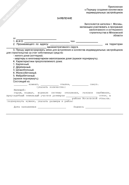 - 1268Заявление о вступлении в коллектив индивидуальных застройщиков для строительства коттеджей и жилой площади в малоэтажных домах Московской области