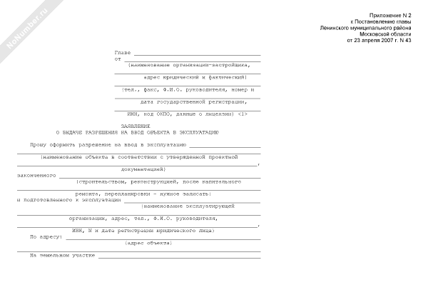 - 1278Заявление о выдаче разрешения на ввод объекта в эксплуатацию на территории Ленинского муниципального района Московской области