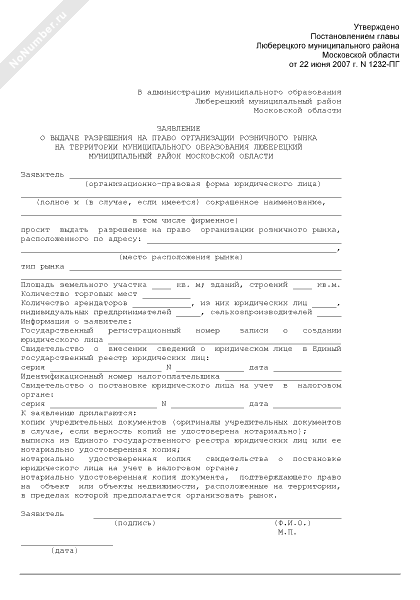 - 1358Заявление о выдаче разрешения на право организации розничного рынка на территории муниципального образования «Люберецкий муниципальный район» Московской области