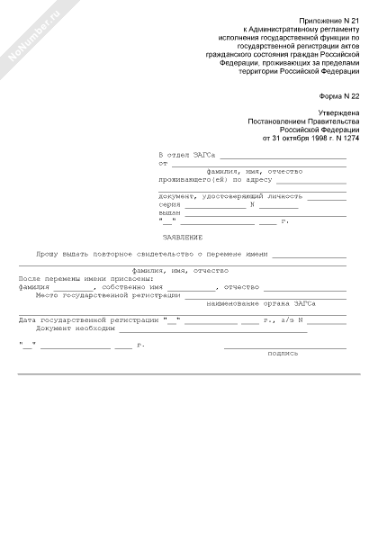 - 1393Заявление о выдаче повторного свидетельства о перемене имени для граждан Российской Федерации, проживающих за пределами территории Российской Федерации (форма № 22)