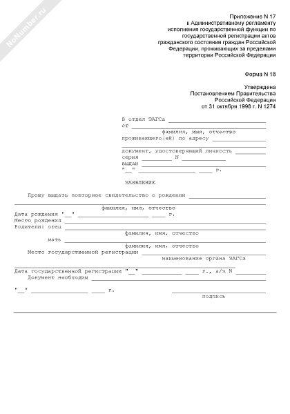 - 1389Заявление о выдаче повторного свидетельства о рождении для граждан Российской Федерации, проживающих за пределами территории Российской Федерации (форма № 18)