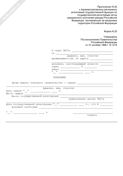 - 1394Заявление о выдаче повторного свидетельства о смерти для граждан Российской Федерации, проживающих за пределами территории Российской Федерации (форма № 23)
