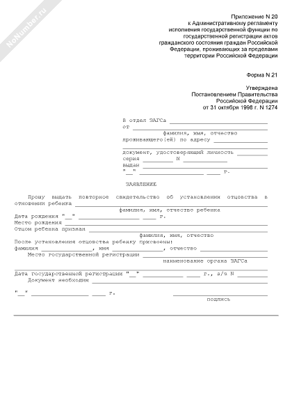 - 1392Заявление о выдаче повторного свидетельства об установлении отцовства в отношении ребенка для граждан Российской Федерации, проживающих за пределами территории Российской Федерации (форма № 21)