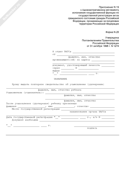 - 1391Заявление о выдаче повторного свидетельства об усыновлении (удочерении) для граждан Российской Федерации, проживающих за пределами территории Российской Федерации (форма № 20)