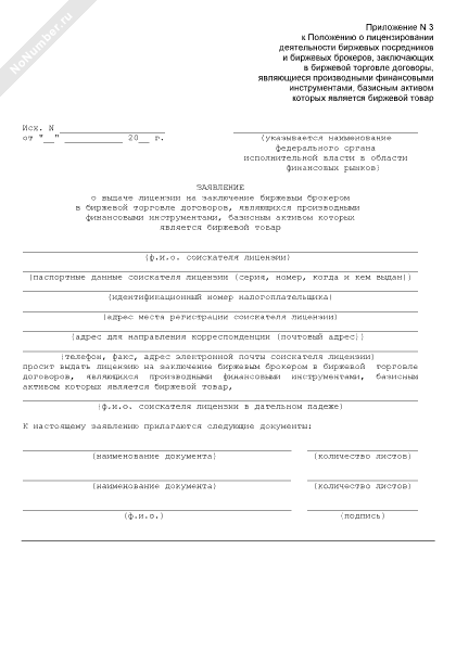 - 1425Заявление о выдаче лицензии на заключение биржевым брокером в биржевой торговле договоров, являющихся производными финансовыми инструментами, базисным активом которых является биржевой товар