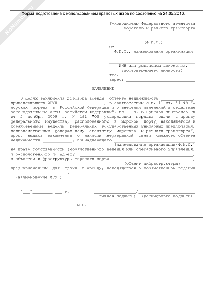 - 1432Заявление о выдаче заключения о наличии неразрывной связи смежного объекта недвижимости потенциального арендатора с объектом инфраструктуры морского порта, предназначенным для сдачи в аренду