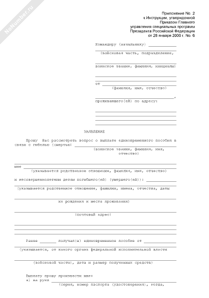 - 1469Заявление о выплате единовременного пособия в связи с гибелью (смертью), наступившей при исполнении служебных обязанностей (в период прохождения службы, в течение одного года после увольнения со службы) военнослужащего