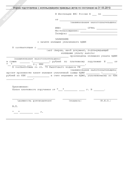- 1566Заявление о зачете переплаты по налогу на доходы физических лиц (НДФЛ), уплачиваемому по одному коду бюджетной классификации (КБК), в счет недоимки по налогу на доходы физических лиц, уплачиваемому по другому коду бюджетной классификации