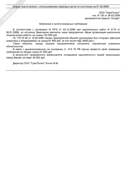 - 1561Заявление о зачете встречных однородных требований