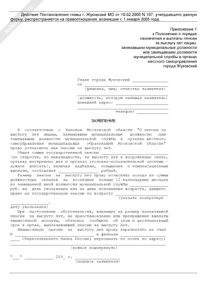 - 1592Заявление о назначении пенсии за выслугу лет лицам, замещавшим должности муниципальной службы в органах местного самоуправления города Жуковский Московской области