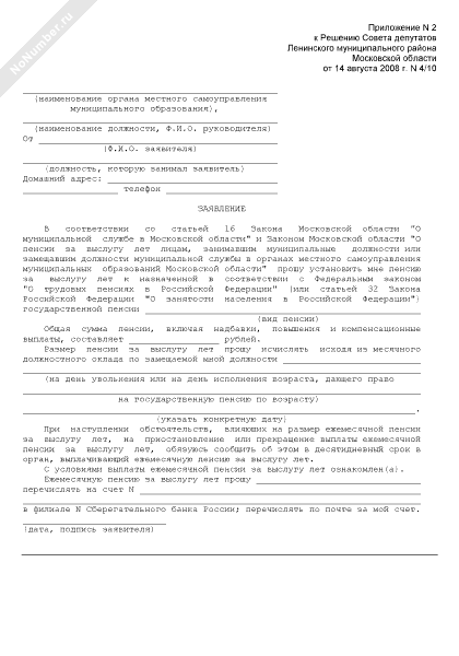- 1586Заявление о назначении пенсии за выслугу лет лицу, занимавшему муниципальные должности или замещавшему должности муниципальной службы в органах местного самоуправления Ленинского муниципального района Московской области