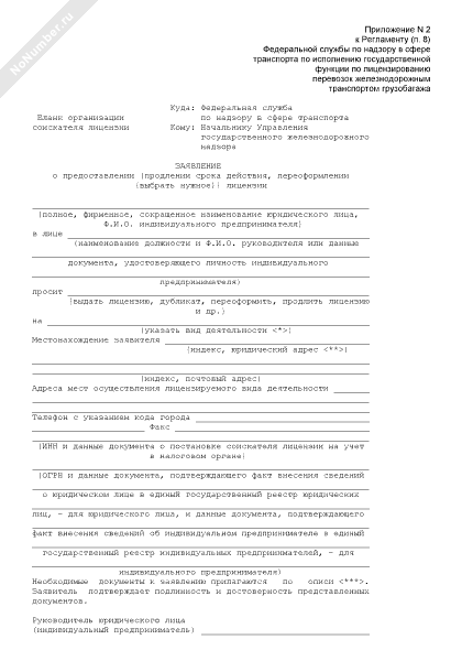 - 1872Заявление о предоставлении (продлении срока действия, переоформлении) лицензии на транспортировку грузов по железнодорожным путям общего пользования