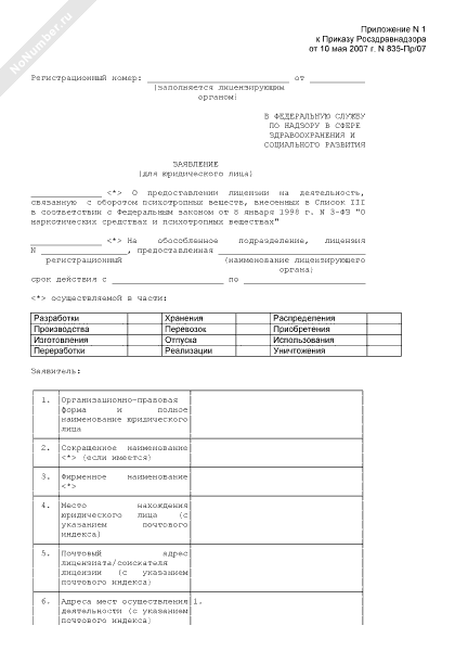 - 1864Заявление о предоставлении лицензии на деятельность, связанную с оборотом наркотических средств и психотропных веществ, внесенных в список II в соответствии с Федеральным законом от 8 января 1998 г. № 3-ФЗ «О наркотических средствах и психотропных веществах»