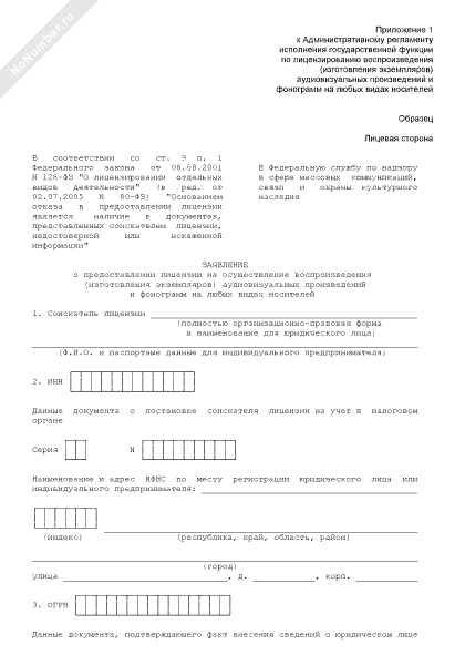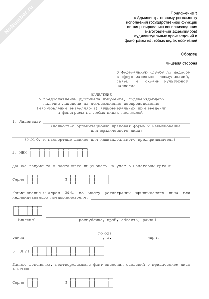 - 1889Заявление о предоставлении лицензии на осуществление воспроизведения (изготовления экземпляров) аудиовизуальных произведений и фонограмм на любых видах носителей