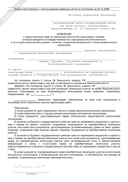 - 1899Заявление о предоставлении прав на земельный участок без кадастрового номера, который находится в государственной или муниципальной собственности и на котором расположены здания, строения, сооружения религиозного и благотворительного назначения