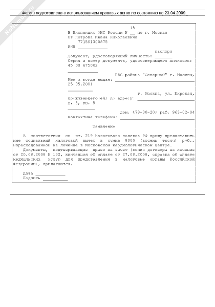 - 1896Заявление о предоставлении социального налогового вычета в связи с расходами на лечение
