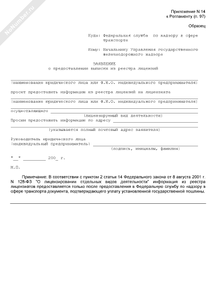 - 1894Заявление о предоставлении выписки из реестра лицензий на осуществление лицензируемого вида деятельности на железнодорожном транспорте