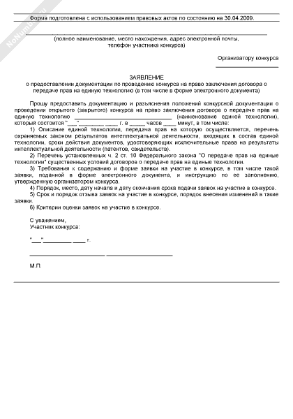 - 1913Заявление о предоставлении документации по проведению конкурса на право заключения договора о передаче прав на единую технологию (в том числе в форме электронного документа)