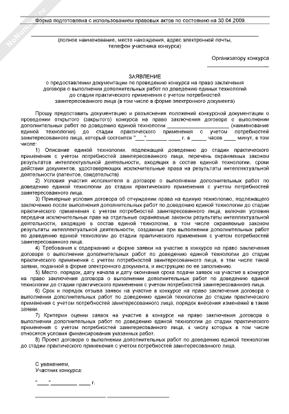 - 1912Заявление о предоставлении документации по проведению конкурса на право заключения договора о выполнении дополнительных работ по доведению единых технологий до стадии практического применения с учетом потребностей заинтересованного лица (в том числе в форме электронного документа)