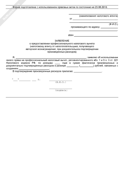- 1920Заявление о предоставлении профессионального налогового вычета (налоговому агенту от налогоплательщика, получающего авторское вознаграждение, при документальном подтверждении произведенных расходов)