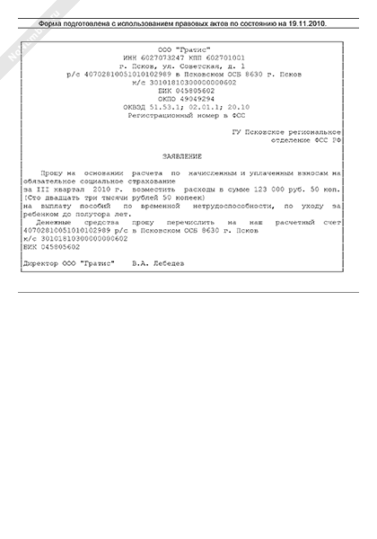 Заявление страхователя в территориальное отделение ФСС РФ для получения возмещения расходов на обязательное социальное страхование (рекомендуемый образец заполнения)