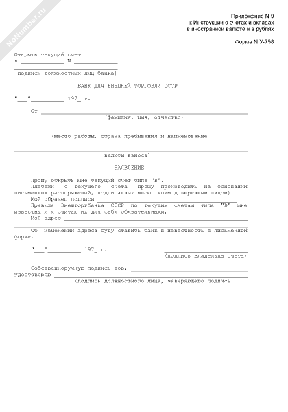 Заявление для оформления открытия счета типа «В». Форма № У-758