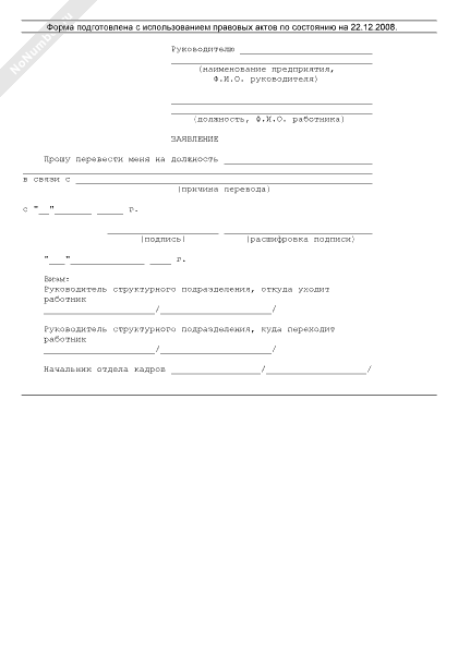 Заявление работника о переводе на другую должность (рекомендуемый образец заполнения)