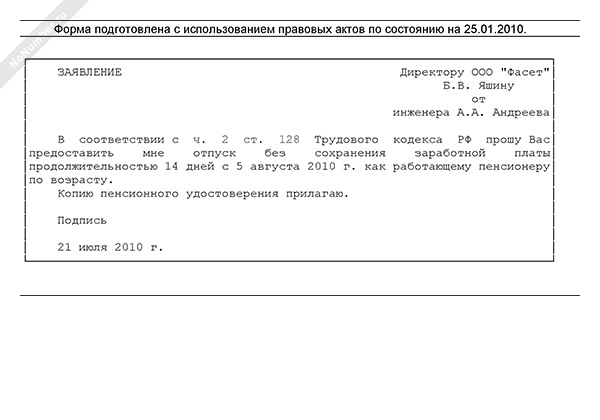 Заявление о предоставлении работающему пенсионеру отпуска без сохранения заработной платы (рекомендуемый образец заполнения)