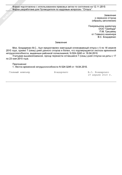 Заявление о перенесении ежегодного оплачиваемого отпуска