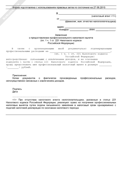 Заявление на получение профессионального налогового вычета