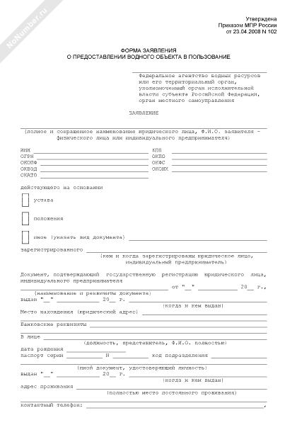 Заявление о предоставлении водного объекта в пользование