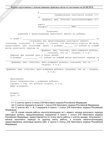 Заявление родителя о предоставлении налогового вычета на ребенка