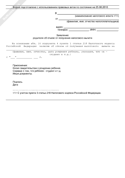 Заявление родителя об отказе от получения налогового вычета на ребенка