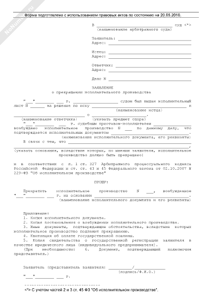 Заявление в арбитражный суд о прекращении исполнительного производства