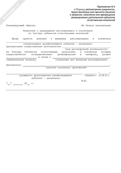 Заявление о прекращении регулирования и исключении из Реестра субъектов естественных монополий (рекомендуемый образец заполнения)