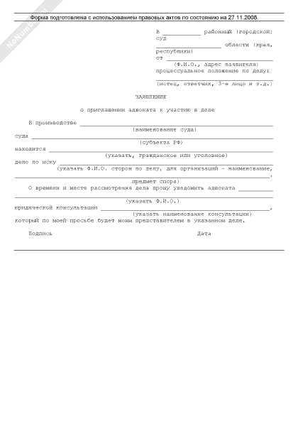 Заявление о приглашении адвоката к участию в деле (рекомендуемый образец заполнения)