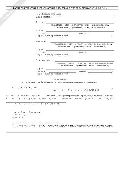 Заявление о принятии арбитражным судом дополнительного решения (рекомендуемый образец заполнения)