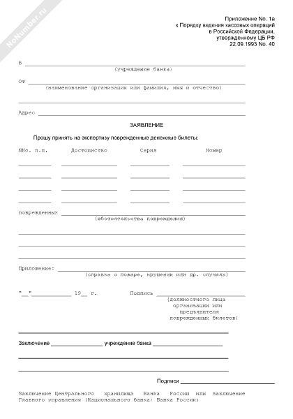 Заявление о принятии на экспертизу поврежденных денежных билетов