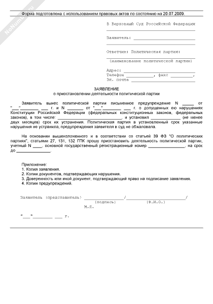 Заявление в Верховный Суд Российской Федерации о приостановлении деятельности политической партии (рекомендуемый образец заполнения)
