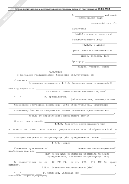Заявление о признании гражданина(ки) безвестно отсутствующим(ей)