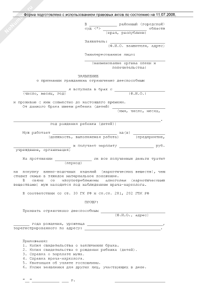 Заявление в суд общей юрисдикции о признании гражданина дееспособным