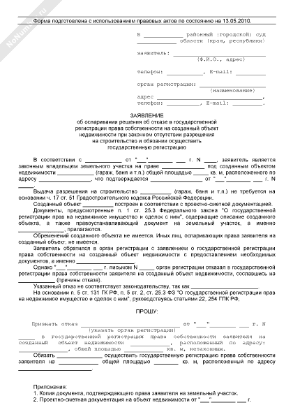 Заявление в суд общей юрисдикции о признании незаконным решения об отказе в государственной регистрации права собственности на созданный объект недвижимости при отсутствии разрешения на строительство в случае, когда такое разрешение не требуется в соответствии с законодательством, и обязании осуществить государственную регистрацию (рекомендуемый образец заполнения)