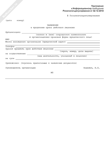 Заявление о продлении срока действия лицензии на деятельность в области производства и оборота этилового спирта, алкогольной и спиртосодержащей продукции (рекомендуемый образец заполнения)