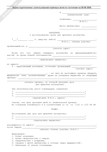 Заявление о восстановлении срока для принятия наследства