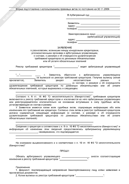 Заявление в арбитражный суд о разногласиях, возникших между конкурсными кредиторами, уполномоченными органами и арбитражным управляющим, о составе, о размере и об очередности удовлетворения требований кредиторов по денежным обязательствам или об уплате обязательных платежей (рекомендуемый образец заполнения)